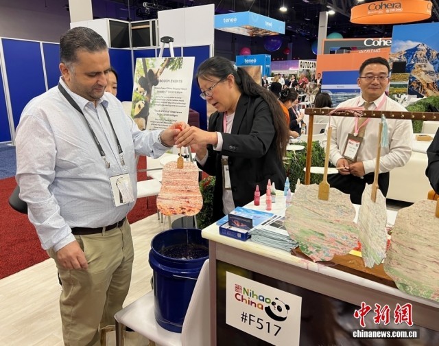 当地时间10月8日,2025年美国会议奖励旅游展(IMEX America)继续在拉斯维加斯举行。这是全球会议及奖励旅游领域最具影响力的展会之一。中国展台举办“中华一刻”——中国非物质文化遗产体验等丰富多彩的活动,吸引众多与会者感受中华文化魅力。图为与会者在中国展台体验漆扇制作。