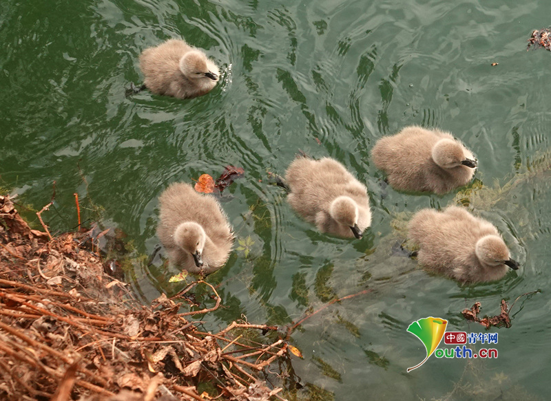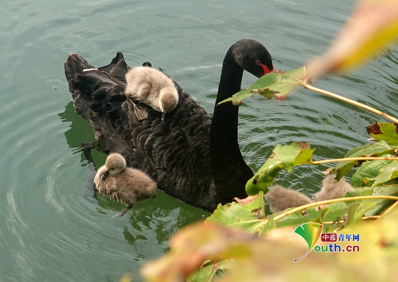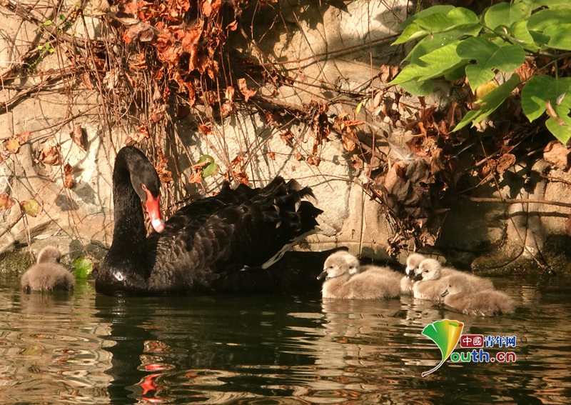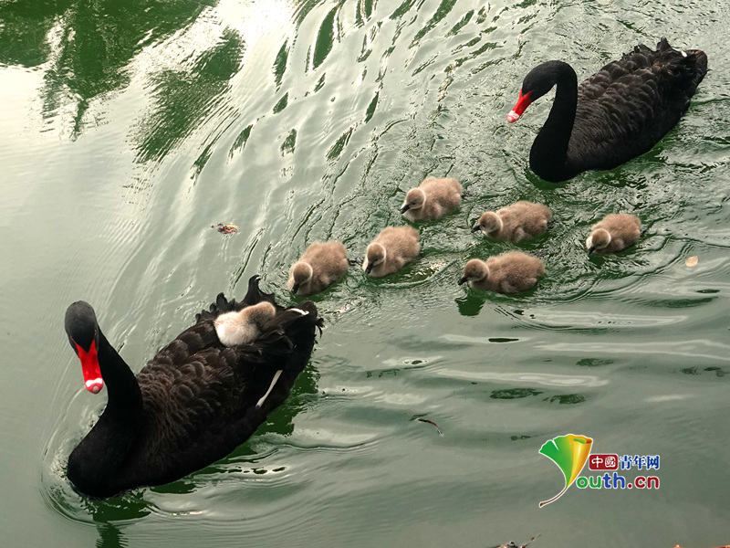 颐和园黑天鹅夫妇带领七只新生宝宝“长途出游”