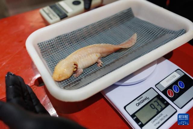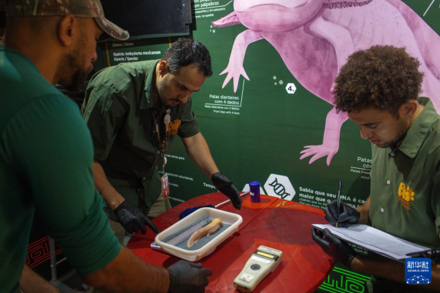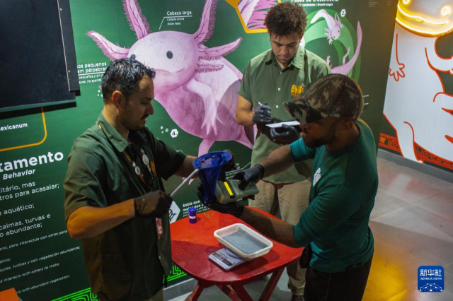 10月8日,在巴西里约热内卢生物公园,技术人员为钝口螈称重和测量体长。
