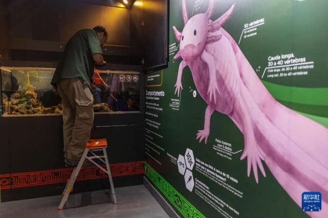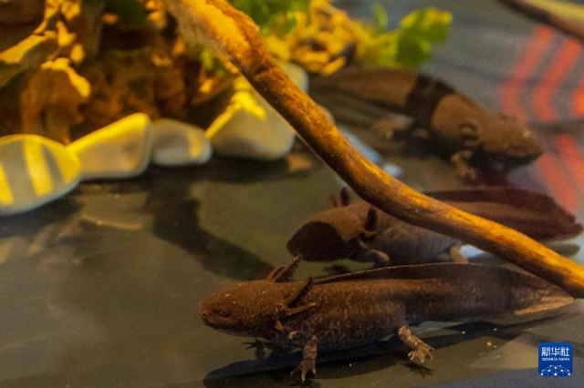 10月8日,在巴西里约热内卢生物公园,钝口螈在新展区的水族箱中活动。