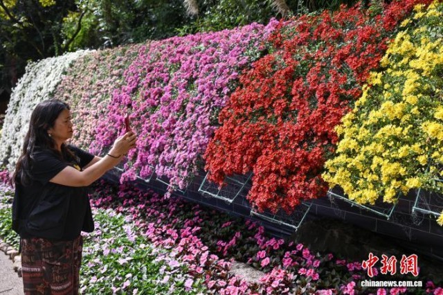 10月10日,云南昆明,“菊花瀑布”吸引游客拍照。中新社记者 李嘉娴 摄