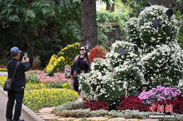 10月10日,云南昆明,菊花制作的大熊猫造型吸引游客拍照。中新社记者 李嘉娴 摄