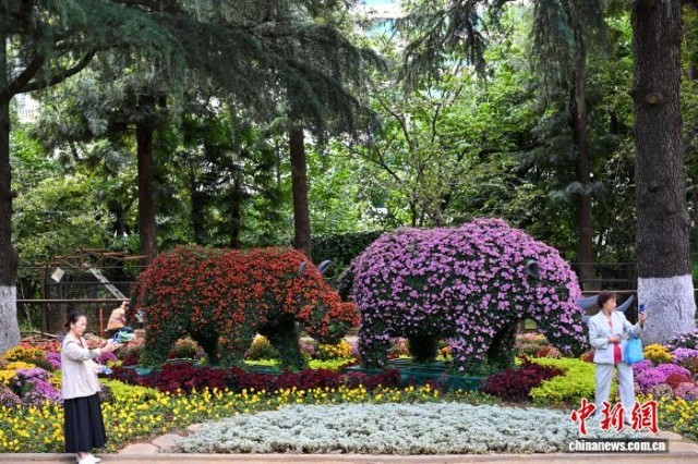 10月10日,云南昆明,菊花制作的大象造型吸引游客。中新社记者 李嘉娴 摄