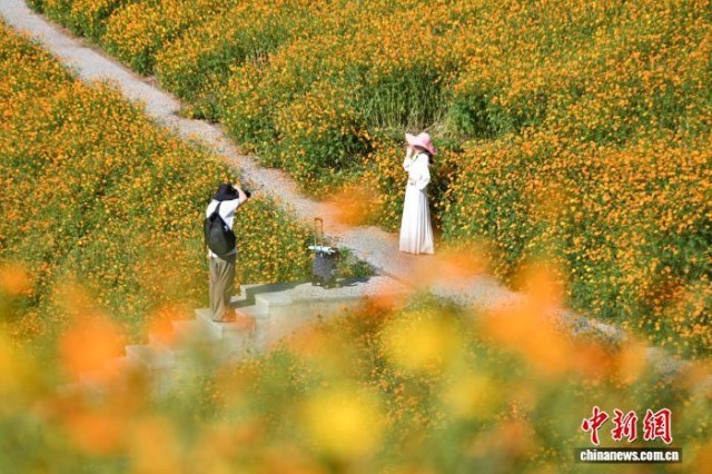 10月10日,市民在重庆溉澜溪体育公园赏花、拍照。近日,重庆江北区溉澜溪体育公园内硫华菊迎来盛花期,金黄花海在秋日阳光下格外夺目,市民漫步其间赏花拍照,尽享城市中的自然之美。中新社记者 何蓬磊 摄