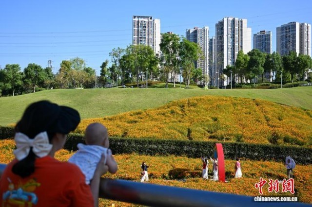 10月10日,市民在重庆溉澜溪体育公园赏花、游玩。中新社记者 何蓬磊 摄