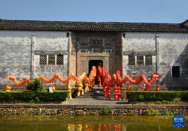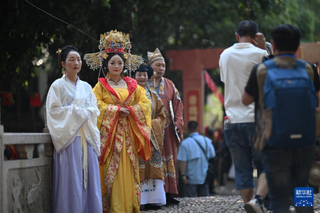 10月12日,身穿古装的村民在寺平村内为游客表演根据本村历史故事编排的情景剧。