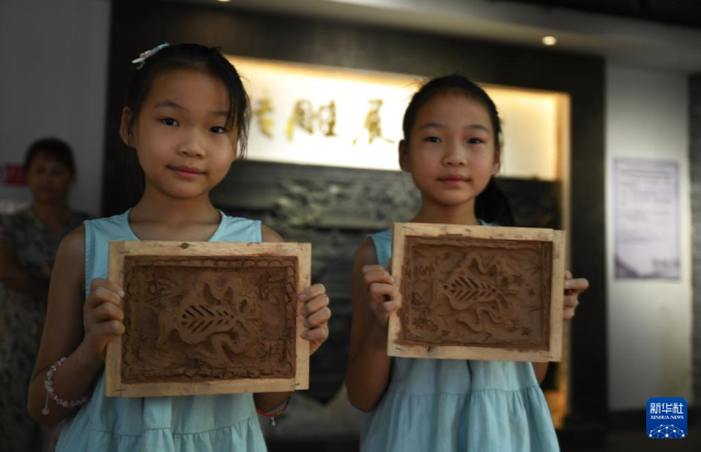 10月12日,参加研学活动的小朋友在寺平村砖雕展示馆内展示自己制作的砖雕作品。