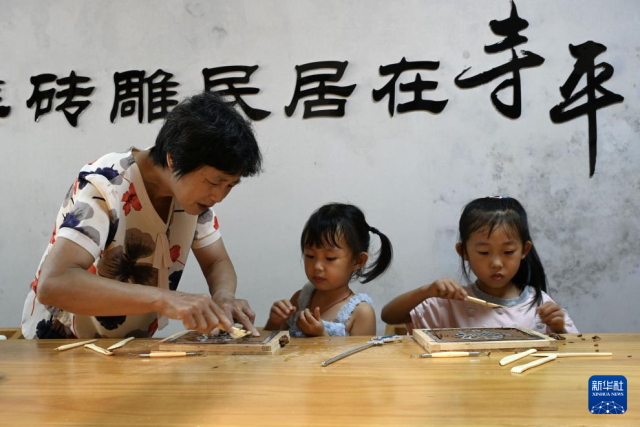10月12日,参加研学活动的小朋友在寺平村砖雕展示馆内体验制作砖雕。