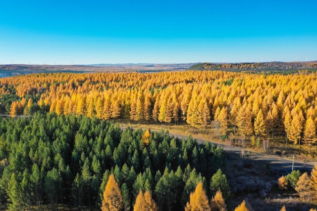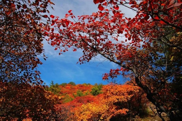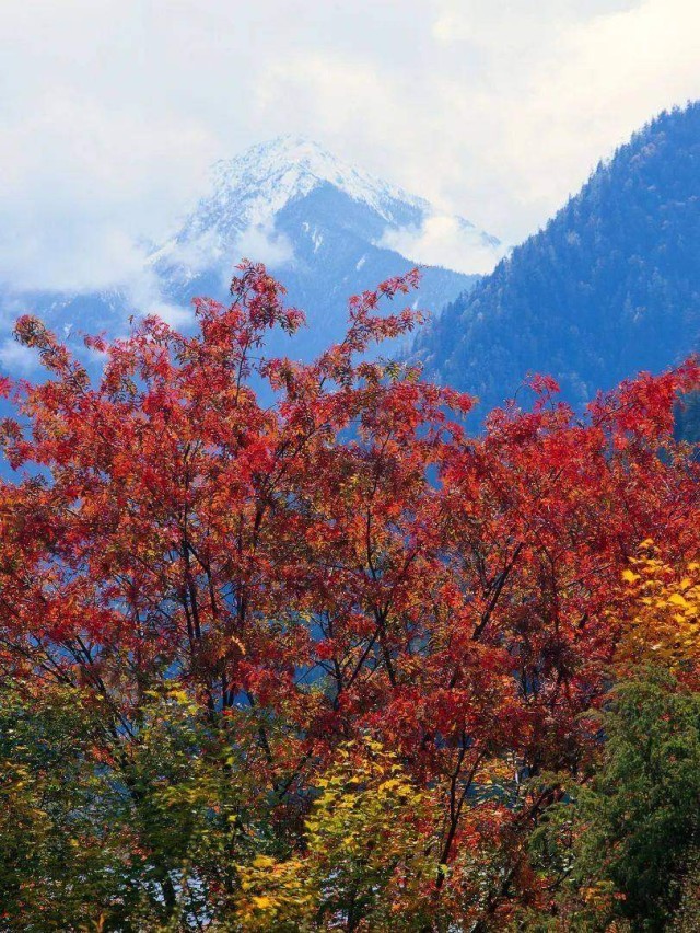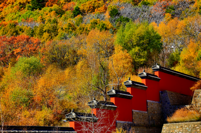 漫山红叶与金黄的桦树、翠绿的松柏交织