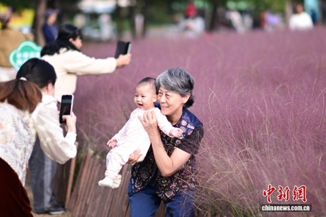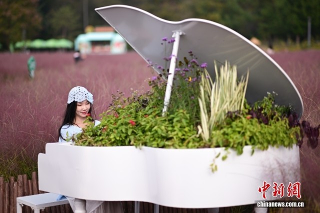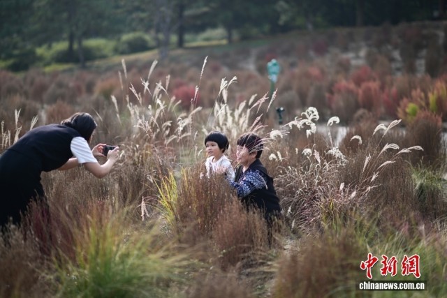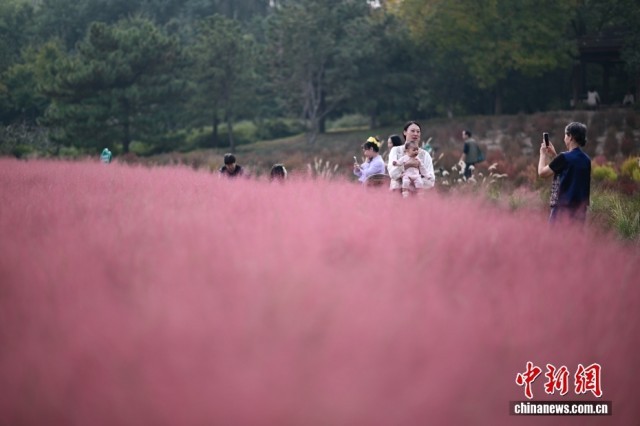 10月15日,市民在奥林匹克森林公园的粉黛乱子草前拍照留念。北京秋意正浓,如画的景色吸引市民。