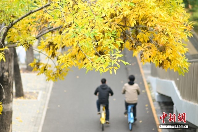 10月15日,北京秋意正浓,市民骑共享单车从黄叶下经过。