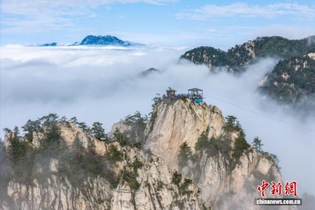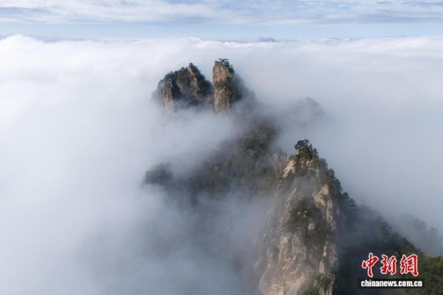 10月16日,河南南阳老界岭出现秋日壮丽云海景观。老界岭是中国南北气候的分界线,长江和黄河流域的分水岭,平均海拔1500米。(无人机照片)薛凯 摄