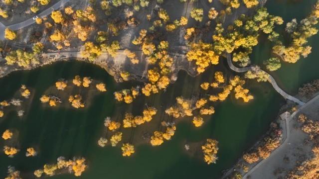 2024年10月13日拍摄的内蒙古阿拉善盟额济纳旗大漠胡杨林景区。 新华社记者 贝赫 摄