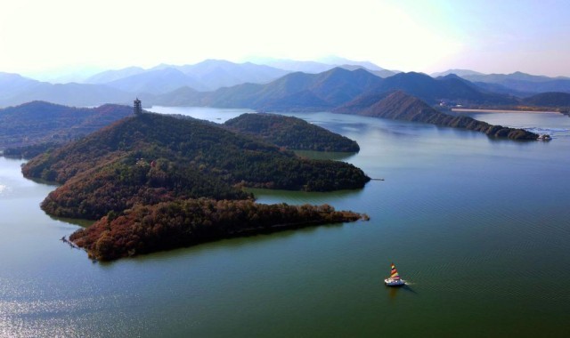 2021年10月23日拍摄的北京市平谷区金海湖景区内景(无人机照片)。新华社记者任超 摄