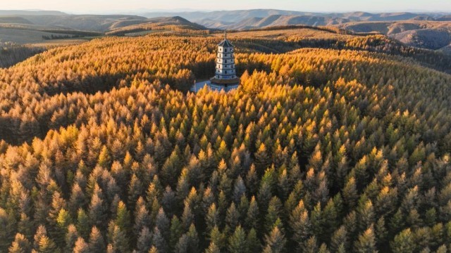 2023年10月14日在河北承德拍摄的塞罕坝国家森林公园秋景。新华社发(刘满仓摄)