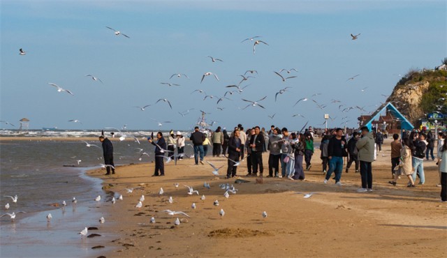 10月18日,游客在秦皇岛北戴河鸽子窝公园观赏海鸟。