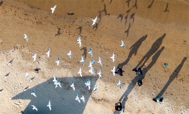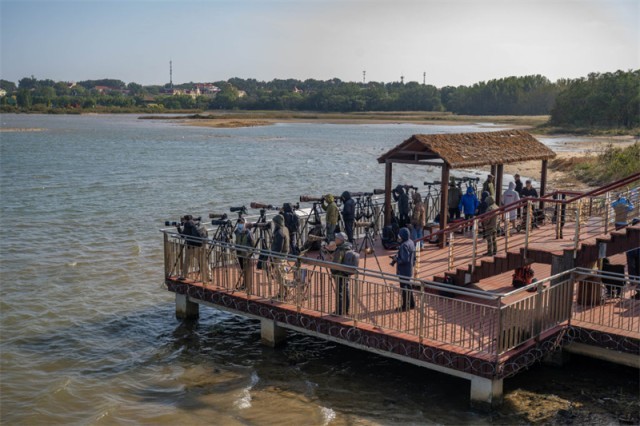 10月18日,游客在秦皇岛北戴河大潮坪木栈道观赏海鸟。