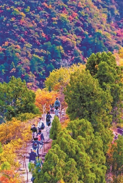 凌空赏“红”线:从香山公园北门入园百余米为客运索道始发站,由此乘缆车上山,可凌空观赏红叶。既可远眺南山红叶幻色炫彩,也可近观脚下红叶的斑斓。约17分钟后到达海拔575米的香炉峰,此时有一种“一览众山小”的感觉。远望是峰峦叠嶂的群山,千林红树,一片秀丽。近看,满眼殷红,每一片红叶都很薄,像是透明的,叶脉清晰可见,宛如晶莹剔透的红玻璃,美得晃眼,令人赏心悦目。
