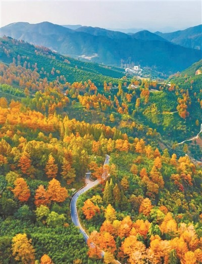 这里树木丛生,道路多掩映于林间,显得格外幽静,而山峰被彩林环绕,若隐若现间仿佛触手可及。尤其是秋雨之后,随着雾气的弥漫,光线若明若暗,为这片彩林增添了几分悠然与神秘之感,令人陶醉在这层层叠叠的美景之中。