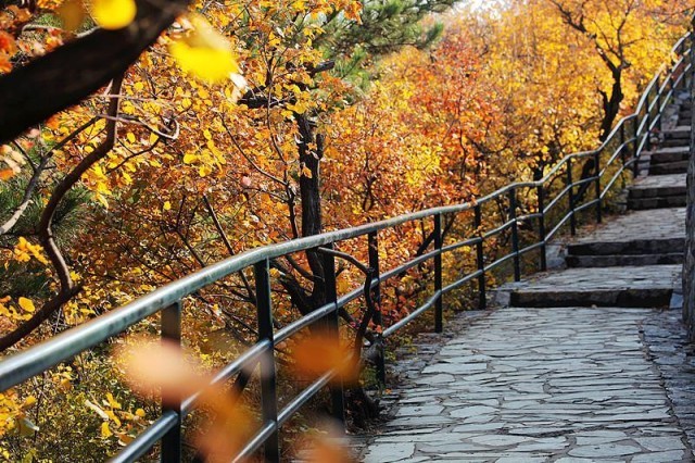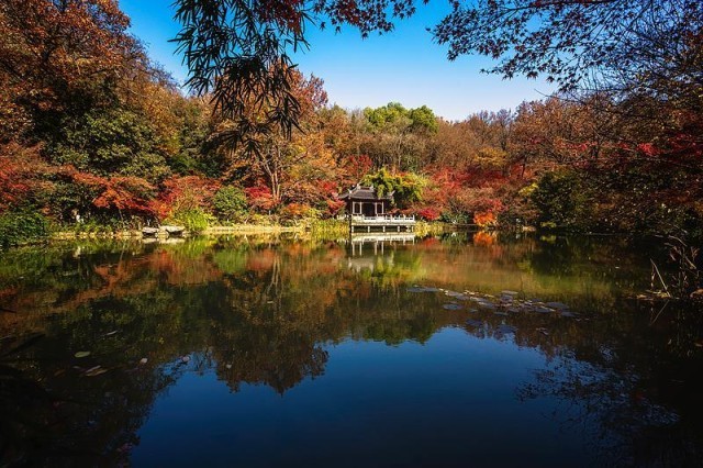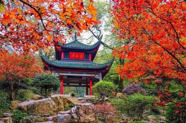 栖霞山的红叶品种繁多,包括红枫、枫香、三角枫等,从嫩黄到深红,浓烈的红、黄、橙交相辉映,像一片灿烂的火海。山中还有石刻等众多名胜古迹,红叶与古刹相映,充满了历史韵味。