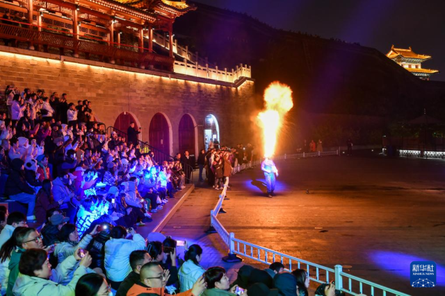 这是10月23日拍摄的忻州古城内的“火壶”表演。