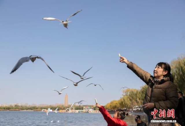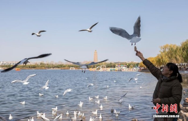 10月26日,宁夏银川市海宝公园内,市民投喂红嘴鸥等候鸟。银川市湖泊、湿地众多,有“塞上湖城”之称,是中国西部以及东亚—澳大利亚鸟类重要的迁徙途经点和栖息繁殖地。中新社记者 杨迪 摄