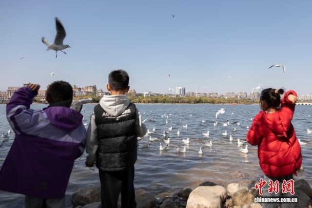 10月26日,宁夏银川市海宝公园内,小朋友投喂红嘴鸥等候鸟。银川市湖泊、湿地众多,有“塞上湖城”之称,是中国西部以及东亚—澳大利亚鸟类重要的迁徙途经点和栖息繁殖地。中新社记者 杨迪 摄