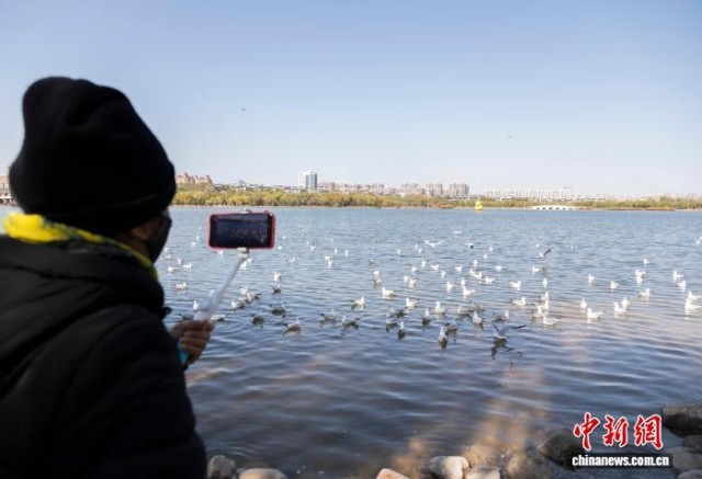 10月26日,宁夏银川市海宝公园内,市民用手机拍摄记录候鸟。银川市湖泊、湿地众多,有“塞上湖城”之称,是中国西部以及东亚—澳大利亚鸟类重要的迁徙途经点和栖息繁殖地。中新社记者 杨迪 摄