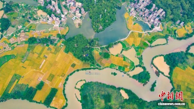 近日,广西梧州市苍梧县旺甫镇大新村稻谷丰收,金黄稻田与青山绿水、村舍道路相映成景,勾勒出一幅诗意乡村画卷。近年来,苍梧县以党建为引领,积极推进田长制、河长制、林长制等多方向融合发展,推动稻谷种植与乡村自然生态融合,在保障生产的同时,打造乡村特色景观,为农文旅融合发展奠定基础。郭庆龙 摄