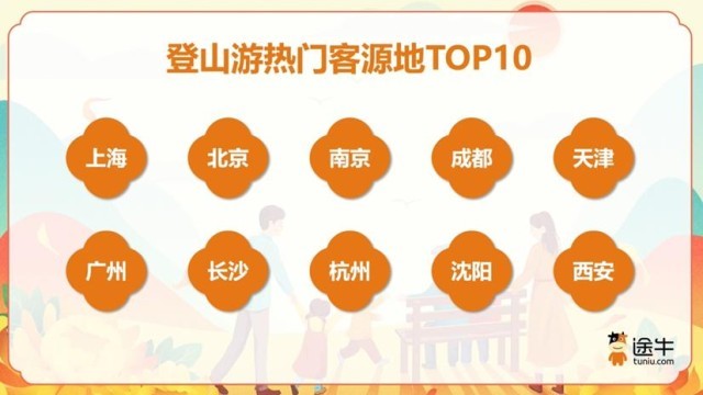 《报告》数据显示,二线及以上城市用户是登山游的主力军,在今年途牛登山游用户中的出游人次占比超过了70%。其中,上海、北京、南京、成都、天津、广州、长沙、杭州、沈阳、西安等是排名靠前的客源地城市。