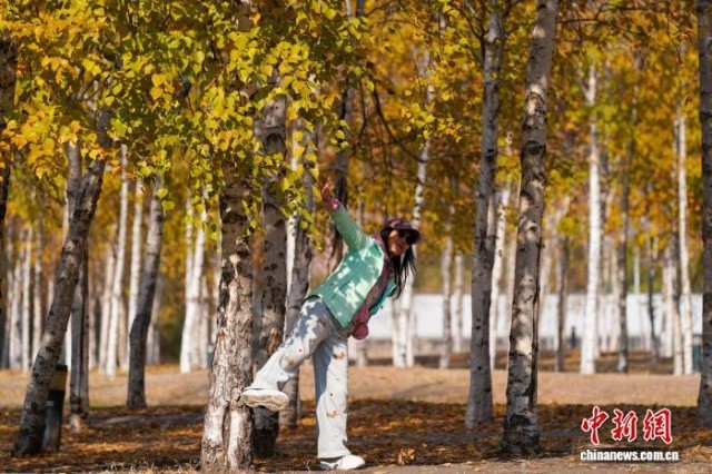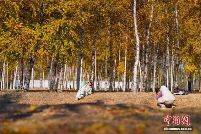 10月28日,黑龙江哈尔滨,市民在白桦林内拍照。中新社记者 赵宇航 摄
