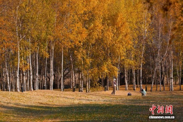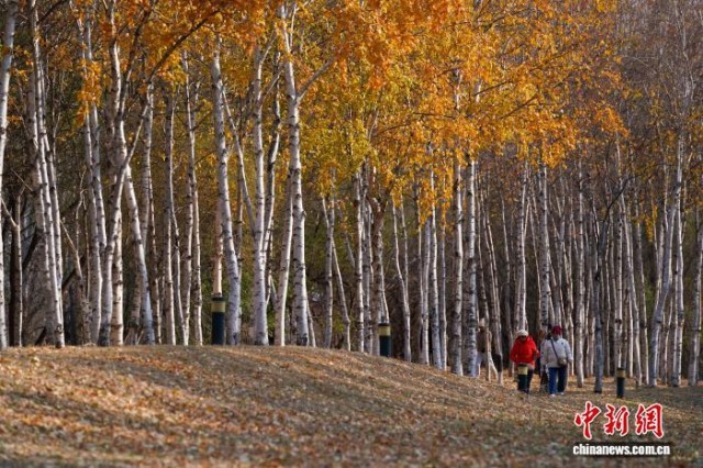 10月28日,黑龙江哈尔滨,市民漫步在白桦林内。随着气温持续走低,哈尔滨大剧院附近的白桦林呈现一片金黄,吸引市民前来感受秋天之美。中新社记者 赵宇航 摄