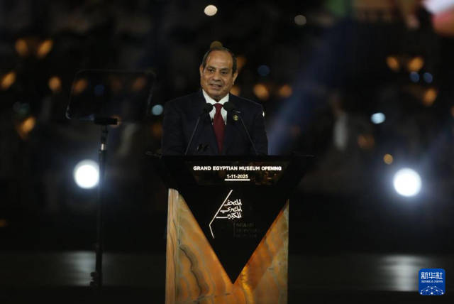11月1日,在埃及吉萨,埃及总统塞西在开馆仪式上致辞。世界最大单一文明博物馆——大埃及博物馆11月1日正式开馆。数十个由各国元首、政府首脑、地区和国际组织负责人率领的官方代表团参加了当晚举行的开馆仪式。新华社发