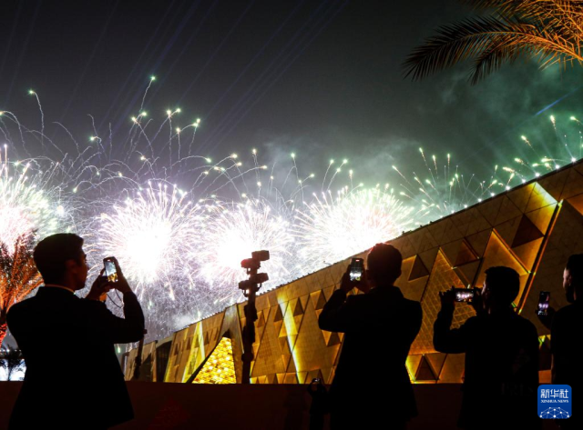 11月1日,人们在埃及吉萨举行的开馆仪式上拍摄烟花和灯光秀表演。新华社发(艾哈迈德·戈马摄)