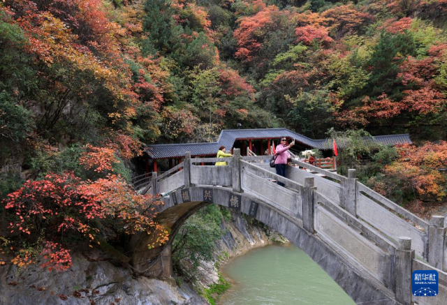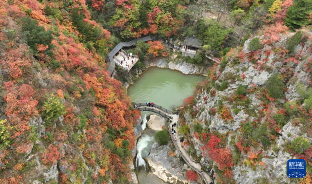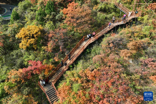 11月2日,游客在河南省沁阳市神农山景区赏红叶(无人机照片)。