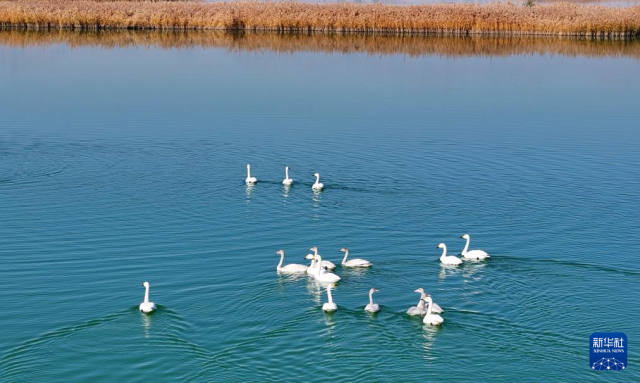 候鸟在宁夏银川市西夏区犀牛湖游弋(无人机照片,11月2日摄)。