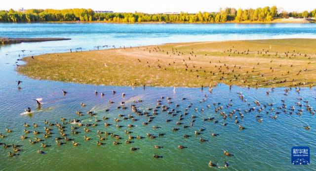11月1日,一群水鸟在位于河南省洛阳市孟津区境内的黄河湿地国家级自然保护区嬉戏(无人机照片)。