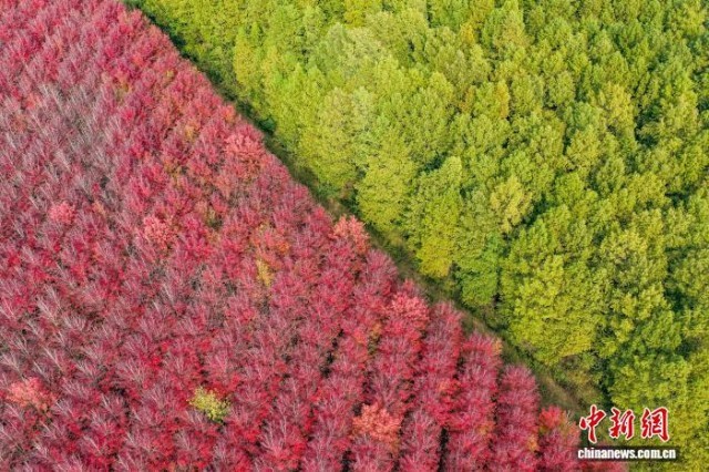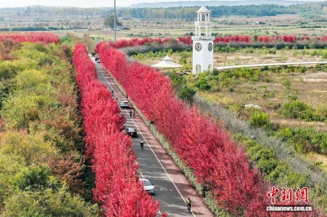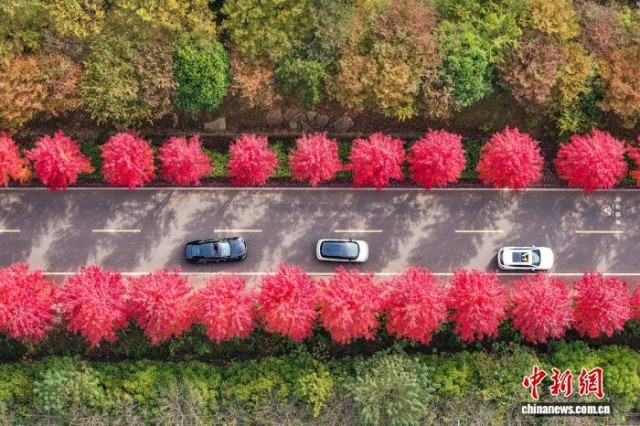 11月3日,江苏南京,大泉湖畔乡村公路两旁枫叶如霞似火,放眼望去,美景如画。(无人机照片)中新社记者 泱波 摄