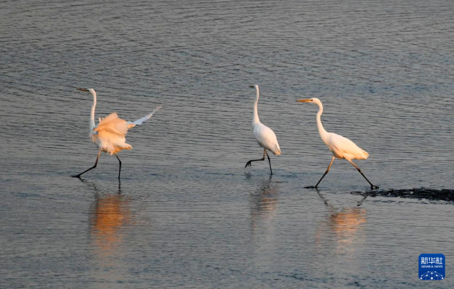 11月3日,在黑龙江省牡丹江市江心岛附近的江滩浅流中,白鹭在觅食。