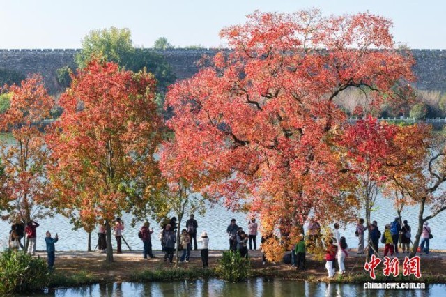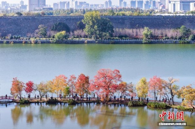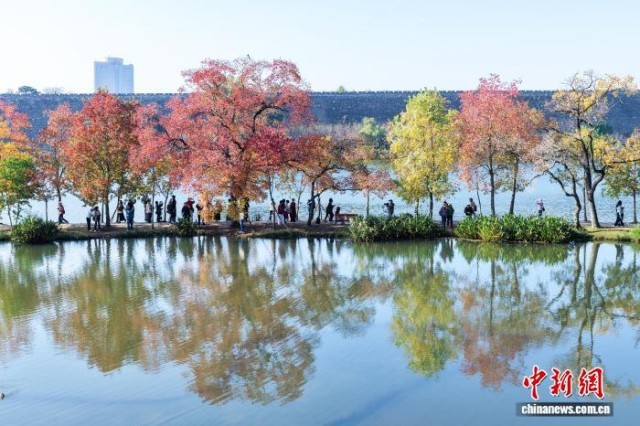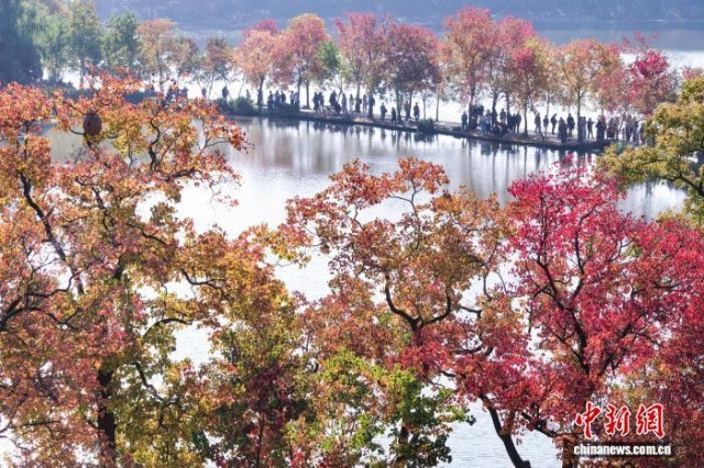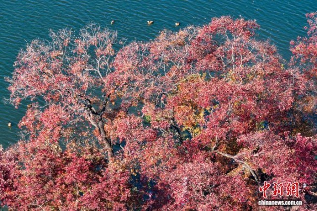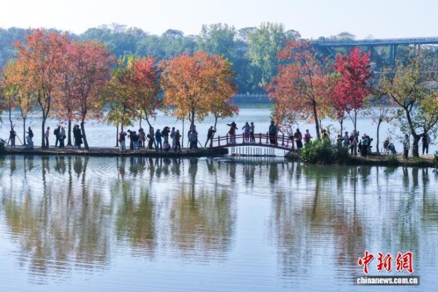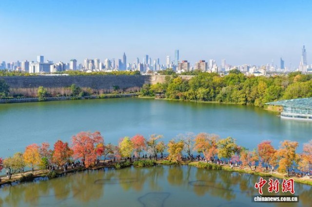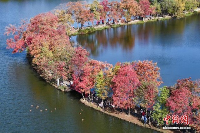 11月5日,江苏南京,紫金山前湖月牙堤迎来观赏佳期,各色树叶五彩缤纷,构成一幅绝美的秋日画卷。(无人机照片)中新社记者 泱波 摄