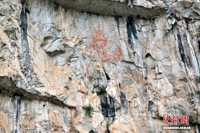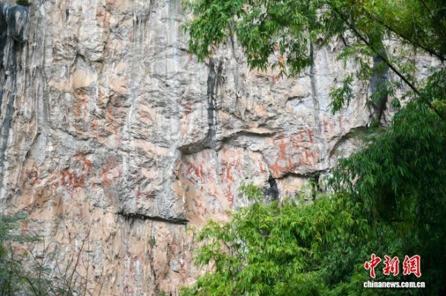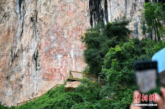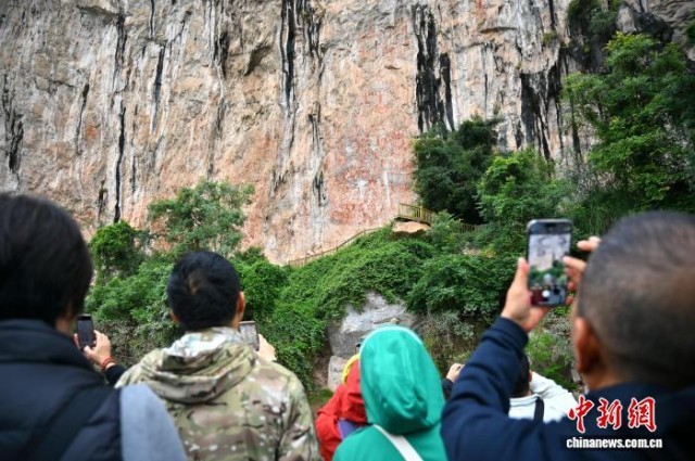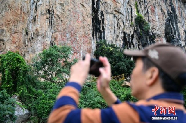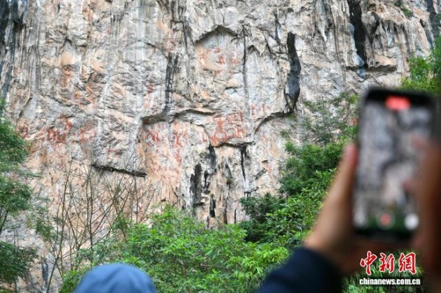 11月5日,地处中越边境的广西崇左宁明县,游人乘船观看花山岩画。花山岩画由壮族先民古骆越人在岩壁上绘制,以造型各异的赭红色图像展现人物以及铜鼓等图像,极富视觉冲击力。宁明花山岩画是左江流域岩画群中图像最多、内容最丰富、保存最完好的一处岩画,被冠以整个左江岩画群的代表。近年来,相关部门开展岩体抢险加固、抢险排危项目保护多个岩画点。图为游人拍摄花山岩画。俞靖 摄