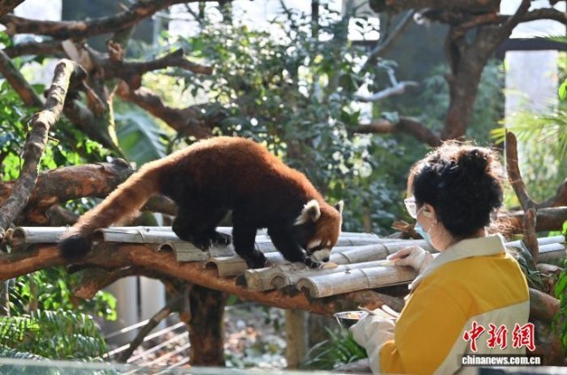 图为保育员为安家于雨林阳光房的小熊猫送上了苹果加餐。中新社记者 张瑶 摄