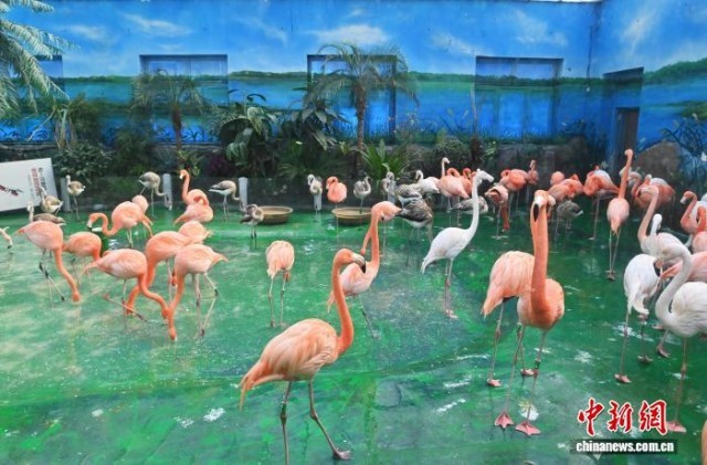 图为火烈鸟在地热暖气房内漫步。中新社记者 张瑶 摄
