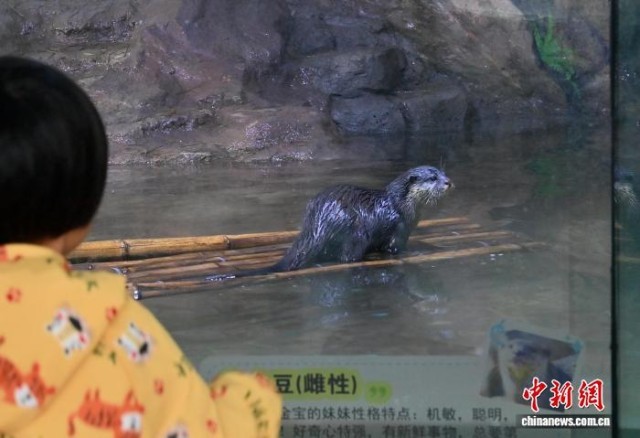 图为水獭在温水池内泡“温泉”,吸引小朋友的目光。中新社记者 张瑶 摄
