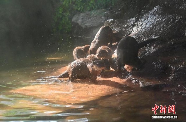 图为水獭在温水池内泡“温泉”享暖阳。中新社记者 张瑶 摄