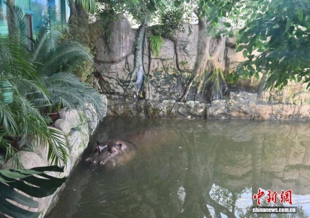 图为河马在温水池内泡“温泉”。中新社记者 张瑶 摄