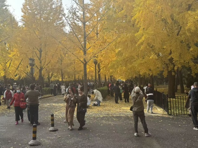 在地坛公园西门外,两侧金黄的银杏树成排而立,枝叶交错成拱,铺出约300米“黄金隧道”。秋风一过,银杏叶簌簌飘落,像下了一场“金雨”。落叶踩上去“咔哧咔哧”直响。数百位游客目不暇接,在树下拍照、捡叶子,走走停停。