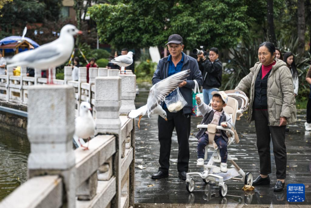 11月10日,游客在云南省昆明市翠湖公园内投喂红嘴鸥。