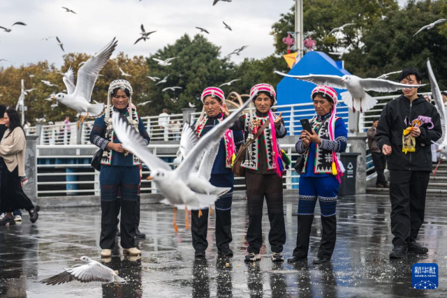 11月10日,游客在云南省昆明市海埂大坝投喂红嘴鸥。