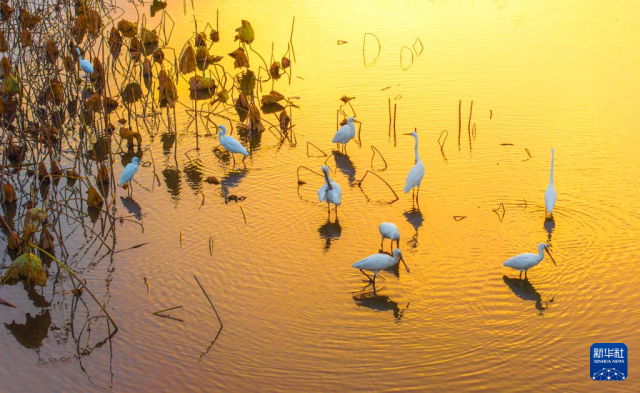 在甘肃省酒泉市阿克塞哈萨克族自治县,白鹭在冬不拉水库栖息觅食(无人机照片,11月9日摄)。